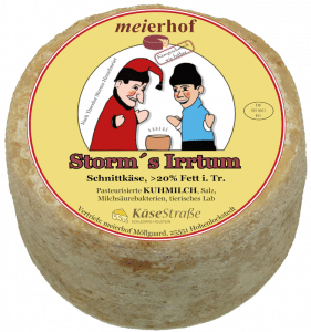 Auf der Suche nach Namen für die besonderen Käse aus Schleswig-Holstein gibt es viele Ideen, um gleichzeitig einen Beitrag zur Erhaltung der regionalen Kultur, Sprachen, Landschaften und Traditionen zu leisten. Bei „Storm ́s Irrtum“ handelt es sich um eine Rezeptur vom historischen „Holsteiner Lederkäse“, der in Theodor Storms Märchen „Hinzelmeier“ wegen der festen Konsistenz irrtümlich für den gesuchten „Stein der Weisen“ gehalten wurde. Die Bauernfamilien in früheren Zeiten haben vorher den Rahm abgeschöpft, daraus Hofbutter gemacht und diese gut vermarktet. Die verbliebene Magermilch wurde zu einem Magerkäse verarbeitet und ca. 5 Wochen gereift, um damit wenig später die Erntehelfer oder Tagelöhner günstig zu beköstigen. Durch den geringen Fettanteil wurde der Käseteig je nach Alter zu einem lederartigen Hartkäse und erhielt deshalb die offizielle Bezeichnung „Holsteiner Lederkäse“. Bis 1951 wurde er als Standardsorte in der Deutschen Käse-Verordnung geführt. Die aktuelle Herstellung aus Kuhmilch und die Grundreifung erfolgen in der Meierei Nordweide im nordfriesischen Süderlügum. Den von den Kunden gewünschten Geschmack erhält der fettreduzierte „Storm ́s Irrtum“ durch die Kellerreifung im Meierhof Möllgaard in Hohenlockstedt.